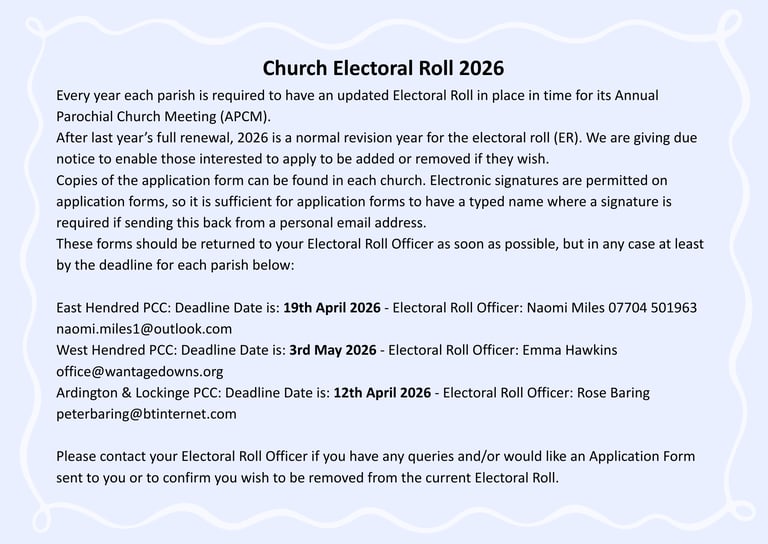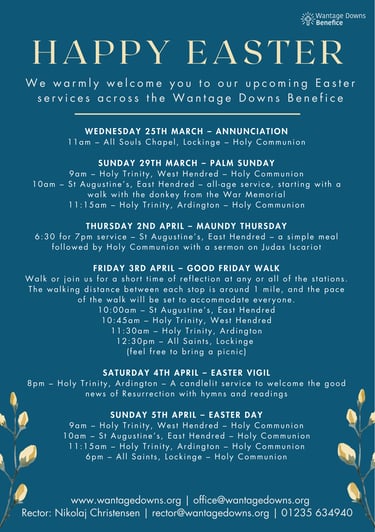 Welcome to the Wantage Downs Benefice! We're a small but friendly Church of England benefice with four churches in the villages of Ardington, Lockinge, West Hendred and East Hendred.